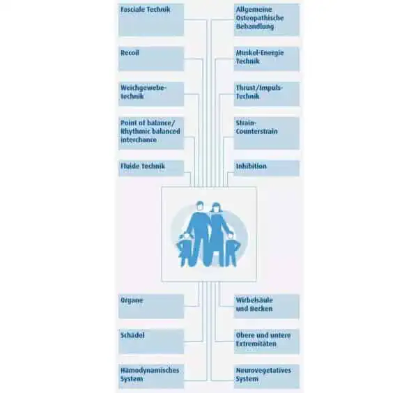 Für Osteopathen stellt der Organismus und der Mensch insgesamt eine Einheit dar. Jeder der folgenden Teilbereiche beeinflusst die übrigen. Sie können nicht getrennt voneinander betrachtet werden. Die Unterscheidung ist rein didaktisch, denn alle Körpersysteme sind miteinander verbunden und agieren in kontinuierlicher Wechselwirkung miteinander, um Gesundheit und Leben zu gewährleisten.
